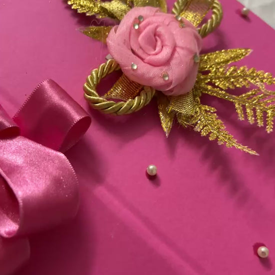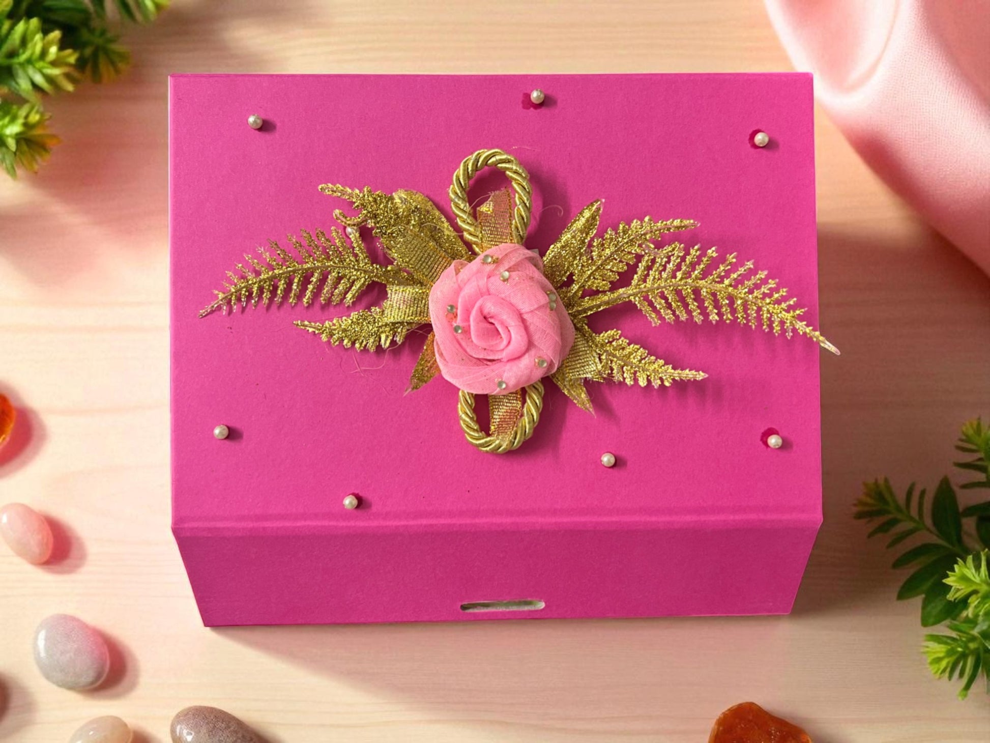 Housed in a vibrant fuchsia box with golden leaves, pearls, and a handcrafted pink rose, this hamper is perfect for birthdays, bridal favors, or thoughtful surprises.