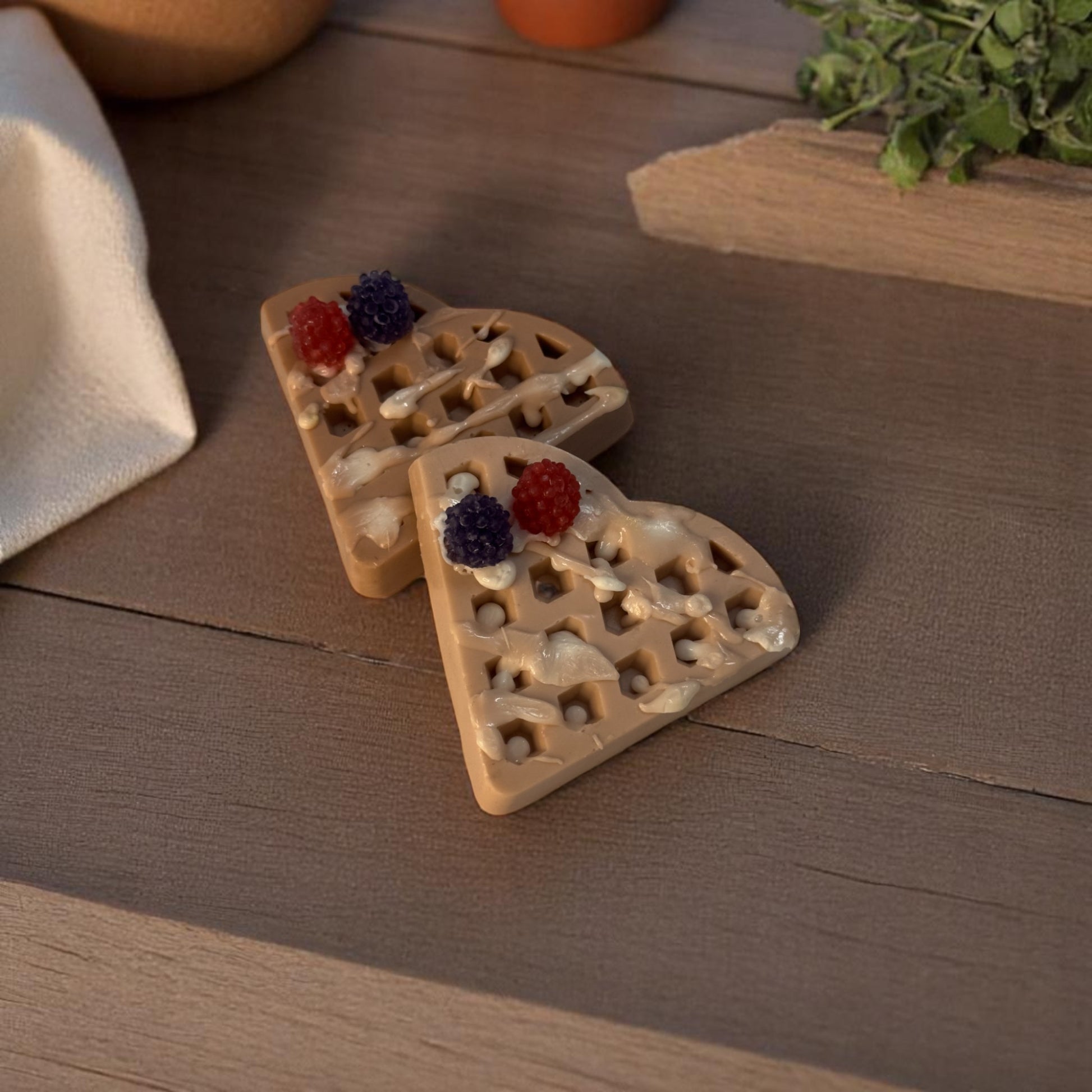 Start your mornings sweetly with our Whipped Berry Waffle Soap Bar – a handcrafted bath treat that looks good enough to eat (but please don’t!). Designed to resemble a fresh-out-the-iron waffle slice, this adorable soap is drizzled with creamy "syrup" and topped with lifelike berry accents for a whimsical touch.